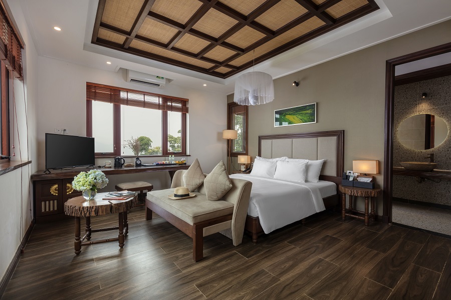Với diện tích trên 40m2, phòng Executive mang đến một không gian sang trọng và tinh tế. Phòng ngủ trang nhã, phòng tắm rộng rãi với bồn tắm và vòi sen riêng biệt, thiết kế nội thất bằng gỗ ấn tượng cùng tầm nhìn tuyệt đẹp hướng núi.