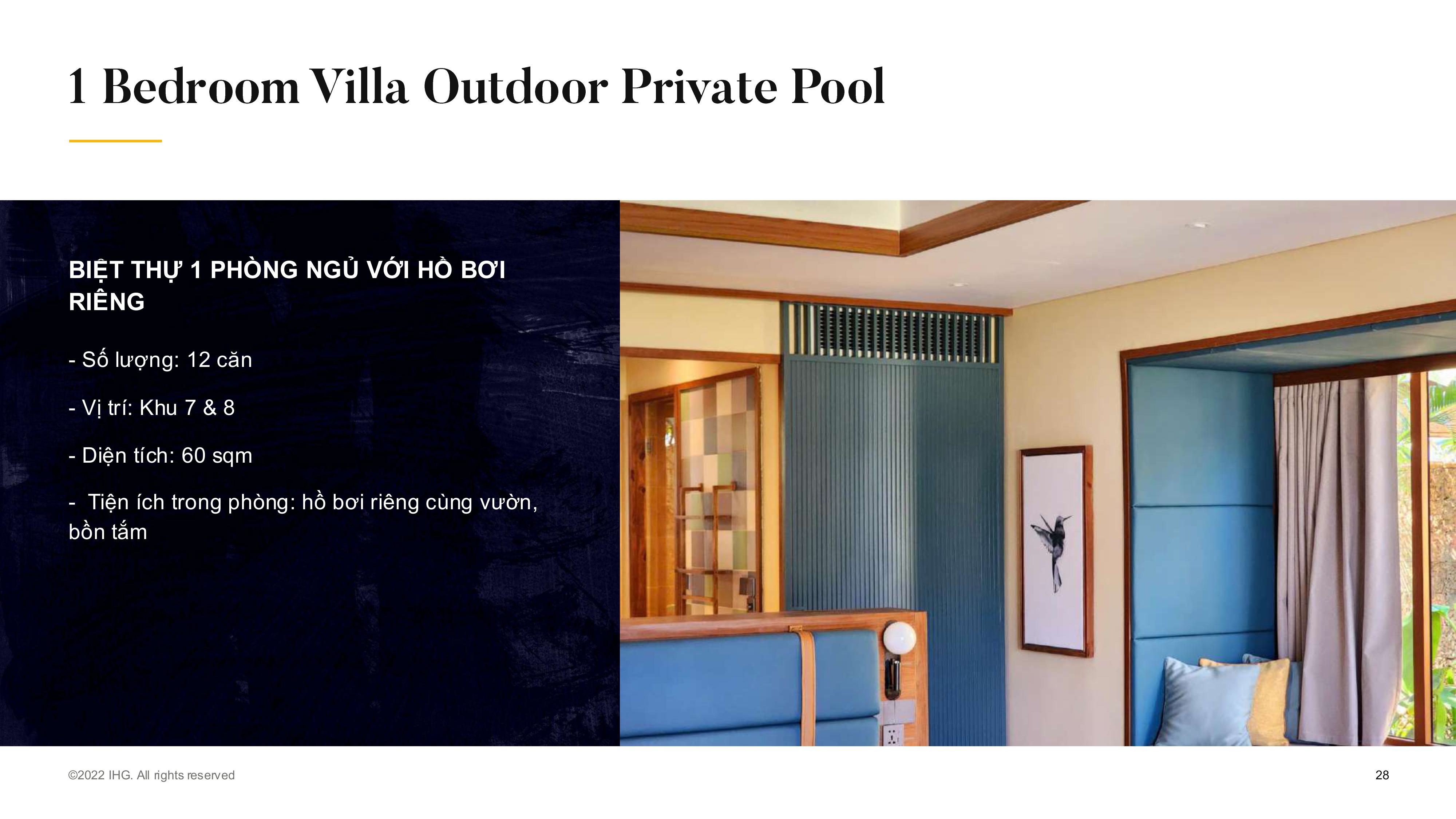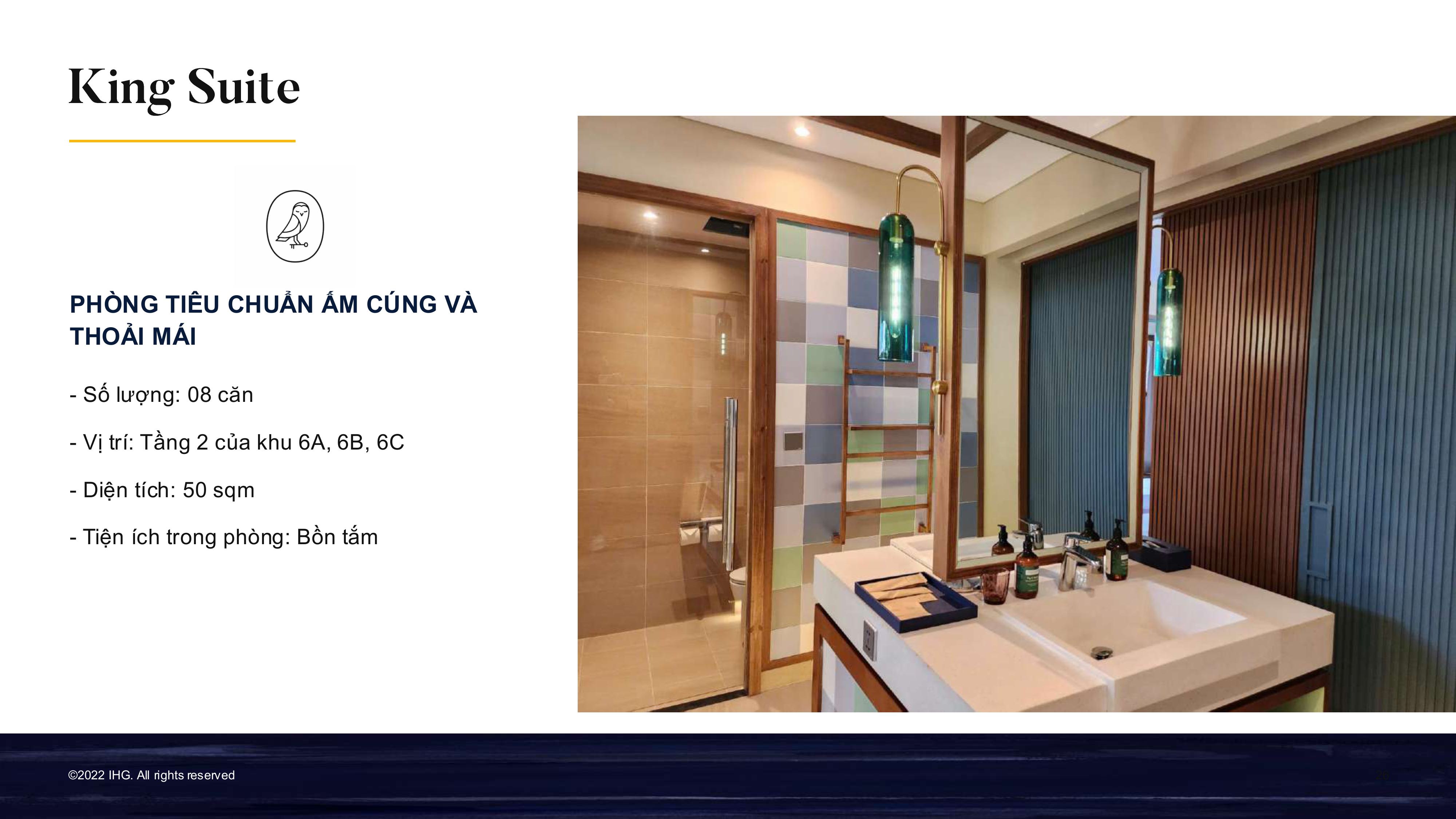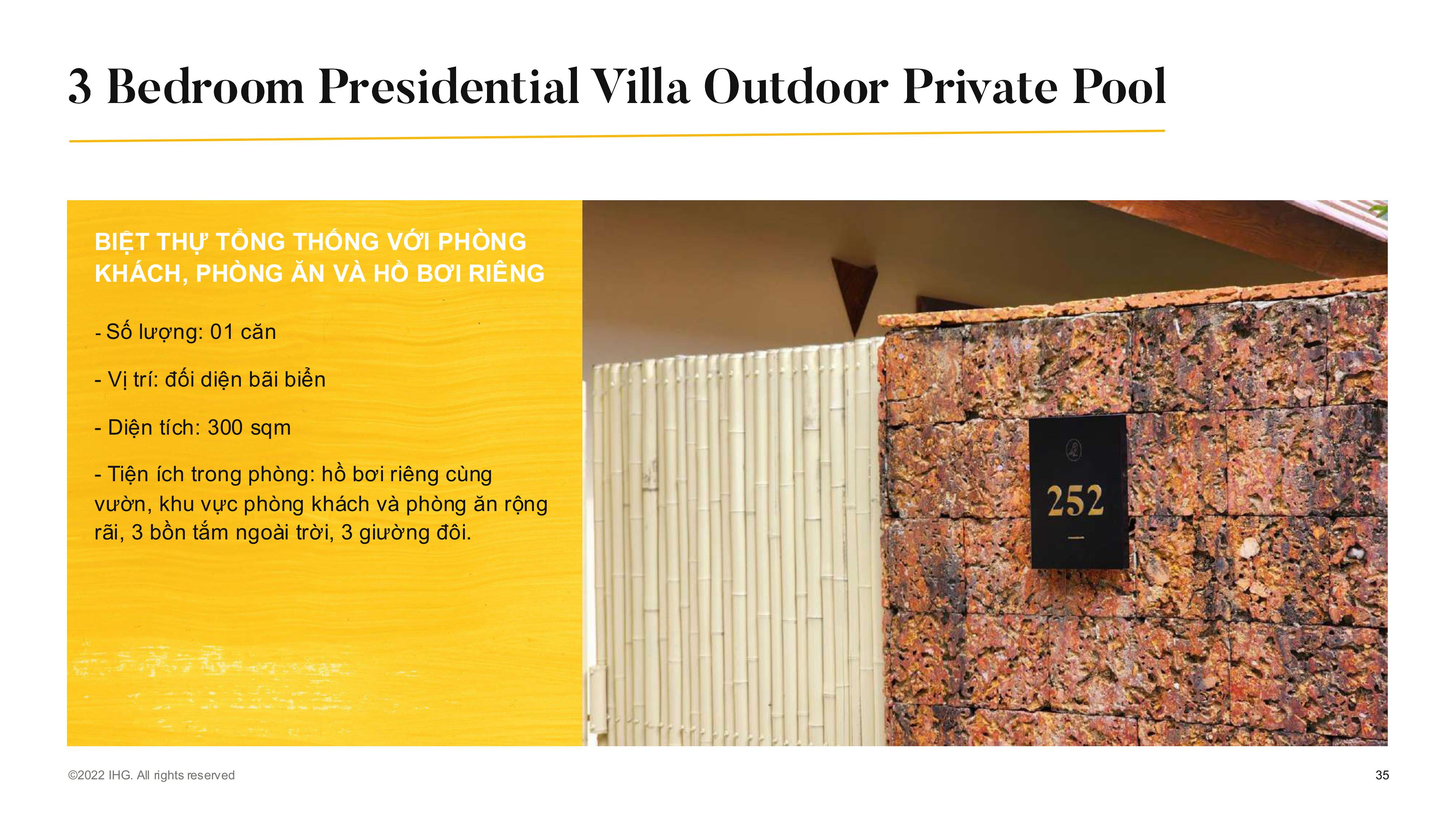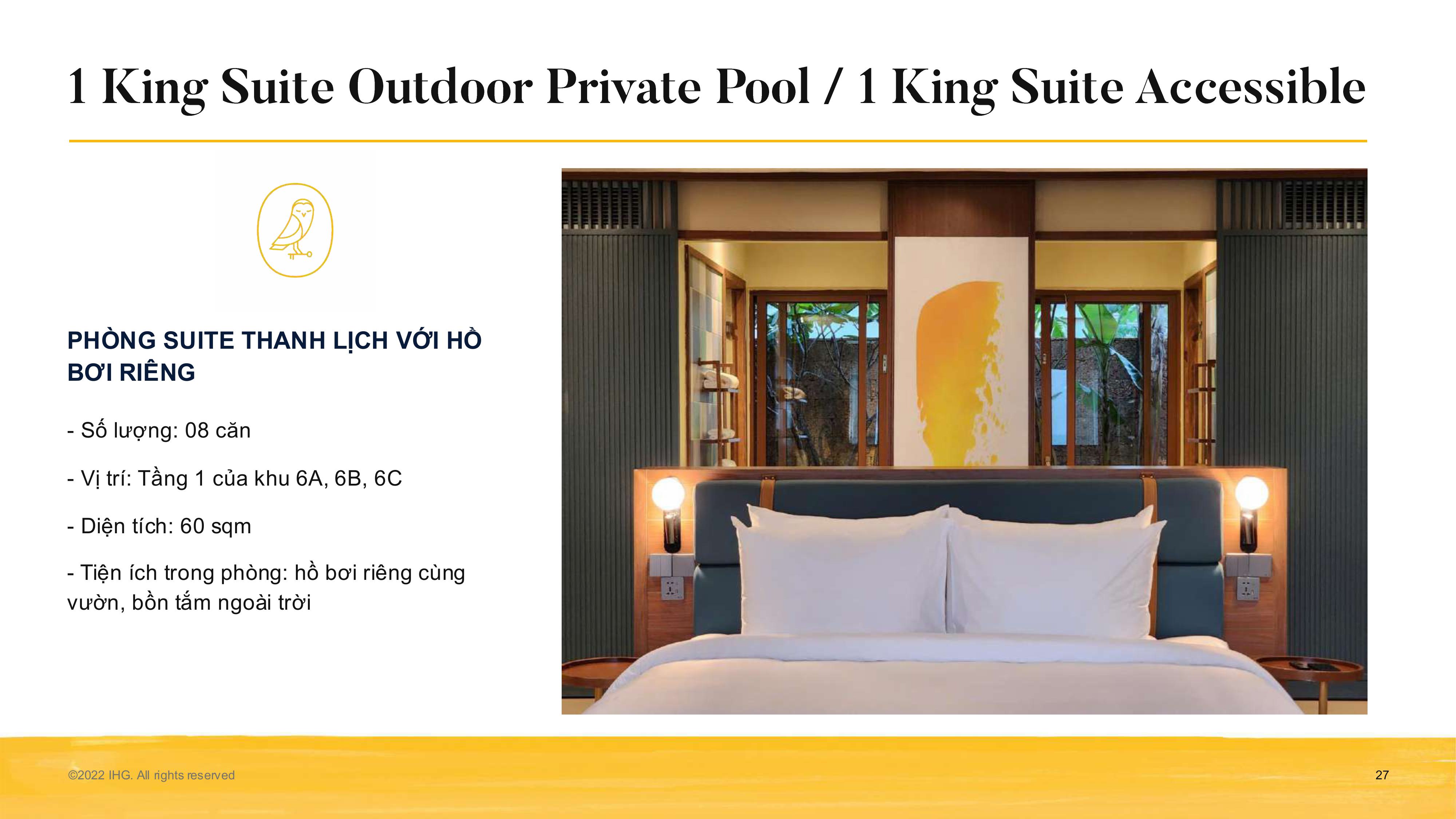 Khu nghỉ dưỡng gồm có 68 phòng Suites và Villas sang trọng với hồ bơi riêng, nội thất tinh tế, thiết kế độc đáo lấy cảm hứng từ văn hóa Việt Nam, tạo nên không gian nghỉ dưỡng đẳng cấp.